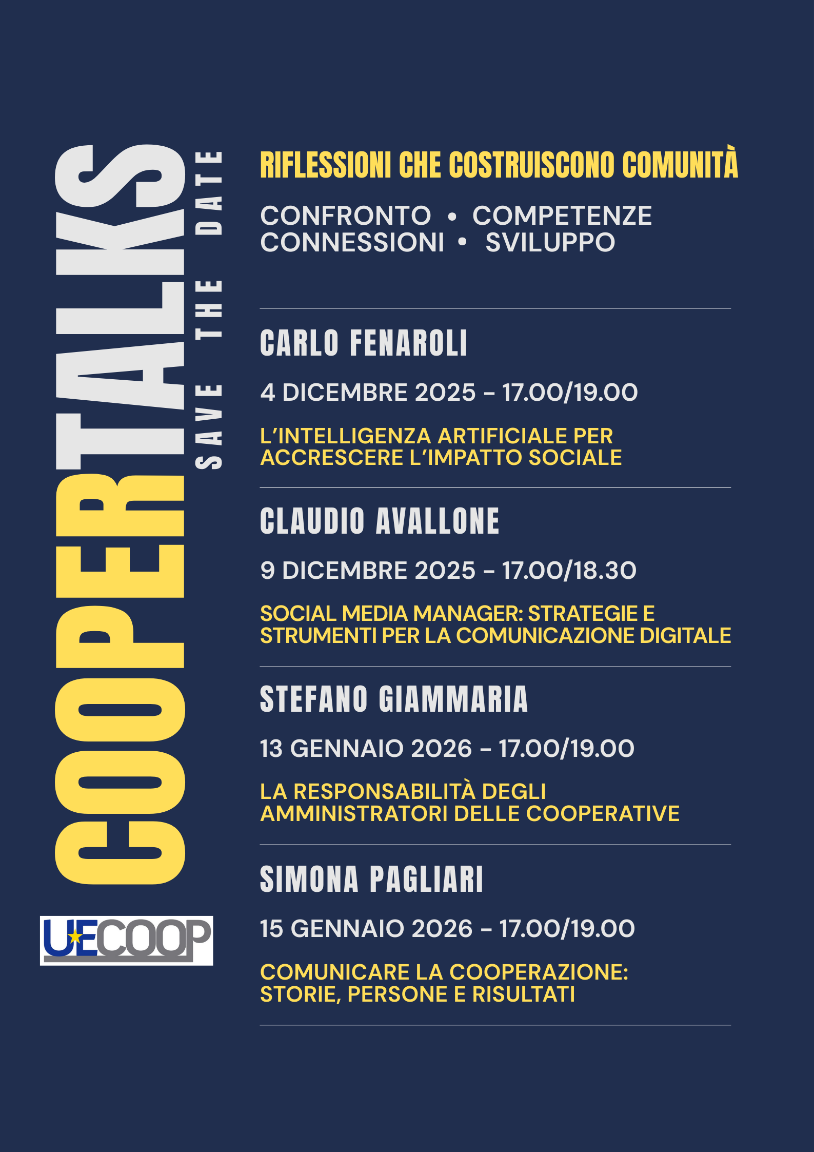 Gli incontri – che partiranno il 4 dicembre p.v. per concludersi il 29 gennaio del nuovo anno – toccheranno aspetti sostanziali per lo sviluppo delle imprese cooperative: dalla comunicazione strategica alla gestione del bilancio, dalla responsabilità degli amministratori alla revisione cooperativa come leva di crescita, fino alla pianificazione degli eventi, al fundraising e all’uso etico dell’intelligenza artificiale per ampliare l’impatto sociale.