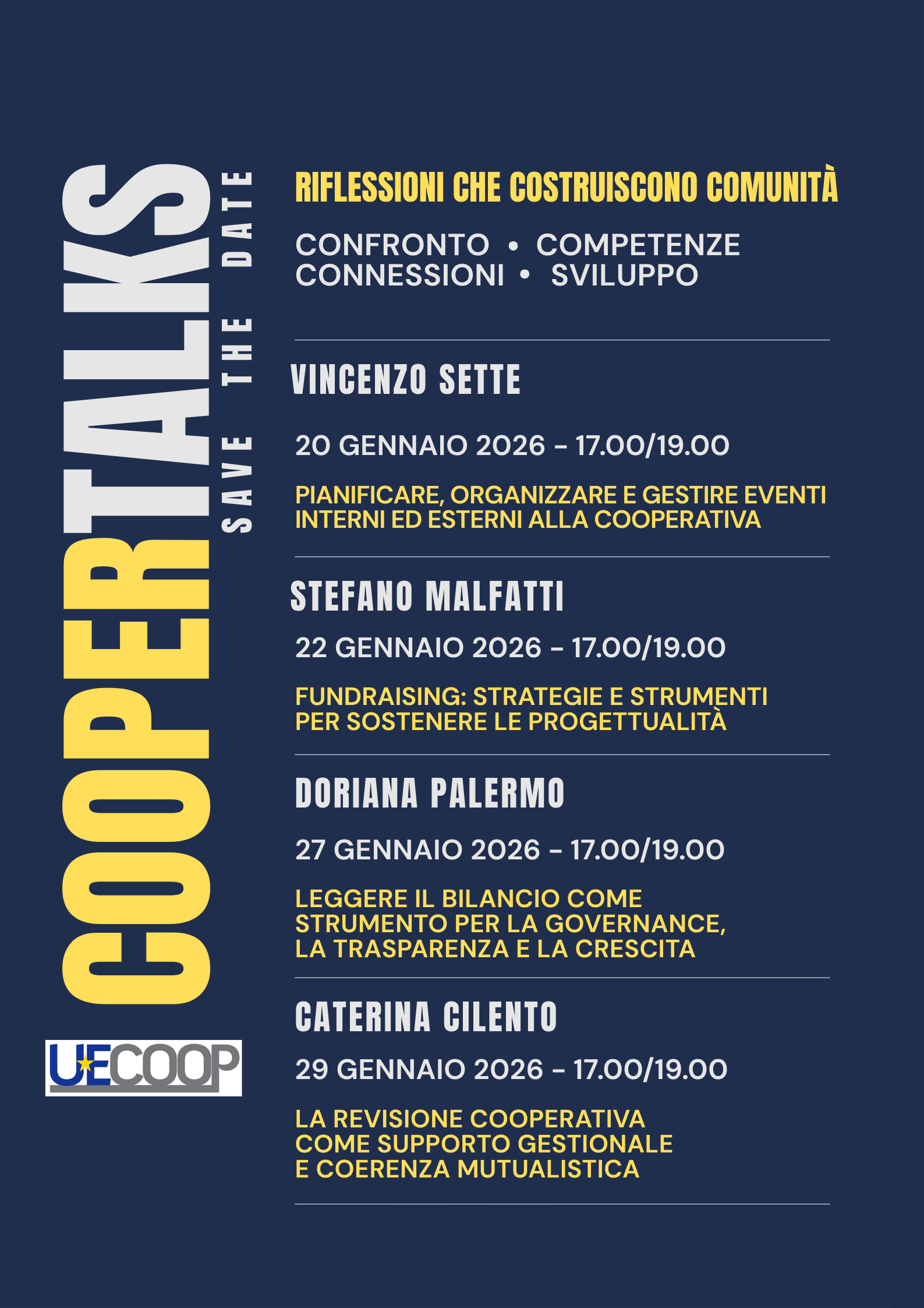 Sta per avviarsi un ciclo di 8 webinar rivolti alle cooperative associate, organizzati da UE.COOP con l’obiettivo di offrire loro strumenti concreti e nuove competenze per affrontare con maggiore consapevolezza le sfide quotidiane. Saranno momenti di confronto dinamico, in cui professionisti esperti metteranno a disposizione il loro know-how per approfondire temi che interessano vari ambiti della vita cooperativa.